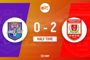 傷停補(bǔ)時(shí)4分鐘。上半場(chǎng)比賽結(jié)束,天津津門虎0-2長(zhǎng)春亞泰。