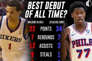 埃奇庫姆首秀幫助76人擊敗凱爾特人,出場42分12秒,投籃26投13中,三分13中5,罰球6中3 ,拿到34分7籃板3助攻1搶斷。