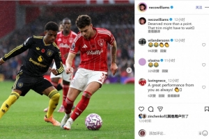 內(nèi)科-威廉姆斯社媒曬出比賽照片,配文調(diào)侃曼聯(lián)蓄發(fā)哥:“我們本應得到不止一分,理發(fā)還得再等等。”