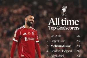 利物浦官方社媒曬出了隊史射手榜,薩拉赫以250球排名第三位,距離首位伊恩-拉什差96球。