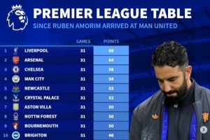 德轉(zhuǎn)列自阿莫林執(zhí)教曼聯(lián)以來各隊(duì)在英超取得的積分情況,阿莫林帶隊(duì)31輪僅取得31分,僅高于上賽季三支英超降級(jí)隊(duì),距第1名31輪取得68分的利物浦相差37分。