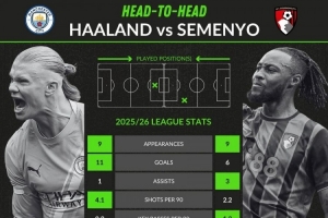 體育資訊11月3日訊 本輪英超,曼城將主場對陣伯恩茅斯。賽前WhoScored列出了兩隊(duì)主要得分手哈蘭德和塞梅尼奧的數(shù)據(jù)對比。