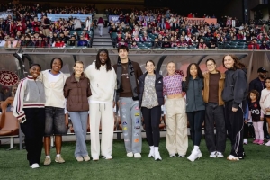 足籃聯(lián)動(dòng)!霍勒迪&阿夫迪亞造訪女足波特蘭荊棘隊(duì) 阿福顛球秀球技