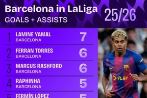 體育資訊11月3日訊 據(jù)Squawka統(tǒng)計,巴薩本賽季5名球員聯(lián)賽參與進球5+,五大聯(lián)賽首隊。