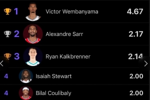 場(chǎng)均封蓋榜上,第二名薩爾約為2.2次。而總封蓋數(shù)上,文班6場(chǎng)比賽28次、第二名的卡爾克布倫納7場(chǎng)15次。