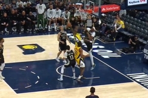 GIF-特納帽翻昆頓-杰克遜,本場第四次蓋帽,此后昆頓回更衣室,步行者官方表示他右腿筋酸痛回歸成疑
