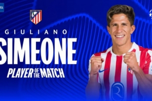 此役朱利亞諾-西蒙尼為馬競首發(fā)出戰(zhàn),助攻阿爾瓦雷斯破門,他當選本場比賽歐冠官方全場最佳球員。