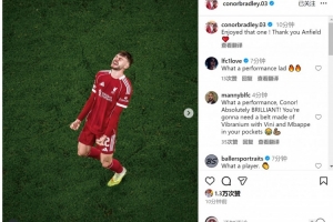 布拉德利當(dāng)選本場(chǎng)比賽利物浦隊(duì)內(nèi)最佳球員,賽后他在社交媒體上曬出照片,配文:“享受這場(chǎng)比賽,謝謝安菲爾德。”