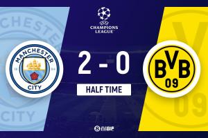 上半場補時2分鐘。半場戰(zhàn)罷,曼城2-0多特。