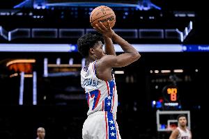 上半場比賽,76人新科探花埃奇庫姆發(fā)揮不佳,在場上受到重點防守,突破幾次被帽。