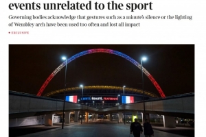 英足總、英超聯(lián)賽和英格蘭足球聯(lián)賽成立了“世界事件工作組”(WEWG),以指導(dǎo)英格蘭足球?qū)χ卮笫澜缡录姆磻?yīng)。除非事件與足球有直接關(guān)聯(lián),否則聯(lián)賽將不會舉行默哀儀式,也不會點亮溫布利球場的拱門。