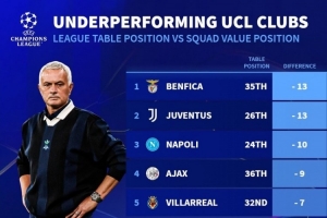 體育資訊11月6日訊 德國轉(zhuǎn)會(huì)市場(chǎng)根據(jù)球隊(duì)目前歐冠排名與陣容身價(jià)排名的差距,列出了本賽季歐冠表現(xiàn)不佳球隊(duì)榜,本菲卡、尤文最差。