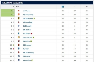2025中甲大結局。第1名遼寧鐵人、第2名重慶銅梁龍升超,第15名廣西平果、第16名青島紅獅降乙。
