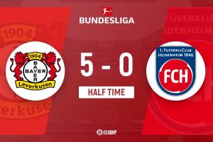 體育資訊11月08日訊 勒沃庫森半場5-0領(lǐng)先海登海姆,對手被迫33分鐘連換兩人。