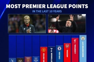 體育資訊11月9日訊 德國轉(zhuǎn)會市場統(tǒng)并列出近10年英超球隊總積分排名,曼城847分居首,利物浦、阿森納二三位。