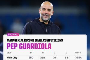 執(zhí)教生涯1000場比賽,瓜迪奧拉取得了716勝156平128負的戰(zhàn)績,勝率超過7成。