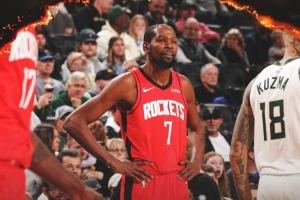 賽后,火箭官方曬出了贏球海報(bào),杜蘭特登上封面。