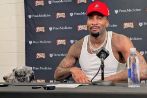 賽后德拉蒙德帶著愛犬出席了球隊(duì)的新聞發(fā)布會(huì),并打趣道:“嘿我哥們兒來啦(My dog's here),是真的狗狗(my actual dog)。”