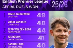 體育資訊11月11日訊 英超聯(lián)賽已經(jīng)進(jìn)行了11輪,squakwa也統(tǒng)計了本賽季英超空中成功對抗次數(shù),塔科夫斯基力壓范戴克居首。