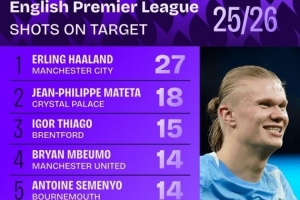本賽季英超射正榜:哈蘭德27次領(lǐng)跑,姆伯莫、恩佐、佩德羅在列