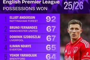 本賽季英超贏得球權(quán)榜:安德森斷崖領(lǐng)跑,B費(fèi)、索博、凱塞多在列