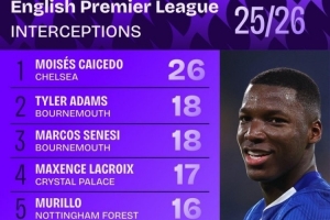 體育資訊11月11日訊 英超聯賽已經進行了11輪,squakwa也統(tǒng)計了本賽季英超攔截次數情況,凱塞多獨自領跑。