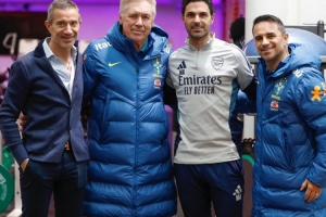 巴西隊在阿森納基地進行訓(xùn)練,安切洛蒂訓(xùn)練之前與阿爾特塔合影,巴西隊社媒曬出照片。