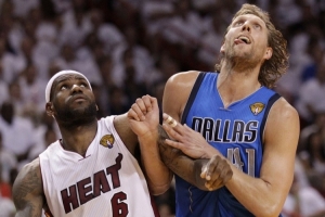 2011年,詹姆斯轉(zhuǎn)投熱火后與小牛在總決賽相遇,雙方大戰(zhàn)6場,熱火2-4丟冠。
