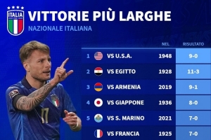 體育資訊11月14日訊 北京時(shí)間11月17日凌晨,意大利將在世預(yù)賽最后一輪比賽中主場(chǎng)對(duì)陣挪威,意大利此役需要至少凈勝挪威9球,才能直接出線。德國(guó)轉(zhuǎn)會(huì)市場(chǎng)列出了意大利隊(duì)史最大比分勝利榜單。