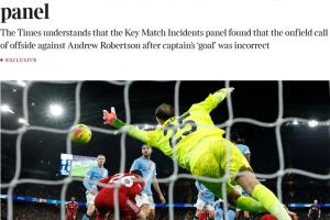 體育資訊11月14日訊 英媒《泰晤士報》報道,英超專家組已經(jīng)裁定,上輪英超范戴克對曼城的進球應被判有效。
