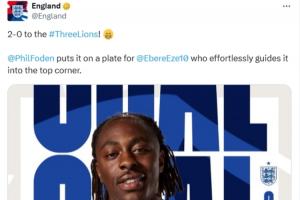 英格蘭官方在播報(bào)進(jìn)球時(shí)寫道:“三獅軍團(tuán)2-0領(lǐng)先!福登將球喂到嘴邊,埃澤毫不費(fèi)力地將球送入上角。”