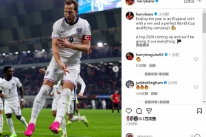 凱恩社媒曬出慶祝進(jìn)球的照片,并寫道:“以一場勝利和完美的世預(yù)賽為今年的國家隊(duì)征程收官,重要的2026年即將到來,我們將全力以赴。”