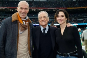 邁阿密海豚和華盛頓指揮官在伯納烏進(jìn)行了NFL在西班牙的首場(chǎng)比賽,賽前,弗洛倫蒂諾走上球場(chǎng),與馬德里自治區(qū)主席伊莎貝爾·迪亞斯·阿尤索以及皇馬傳奇齊達(dá)內(nèi)合影。