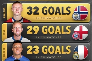 體育資訊11月17日訊 Score90統(tǒng)計(jì)了本賽季五大聯(lián)賽球員俱樂部+國家隊(duì)的進(jìn)球數(shù)量,并列出榜單,哈蘭德32球居首,凱恩、姆巴佩二三位。