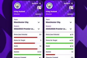 體育資訊11月18日訊 Squawka統(tǒng)計(jì)了哈蘭德22-23賽季(英超36球創(chuàng)紀(jì)錄)和本賽季的數(shù)據(jù),并做出對比。