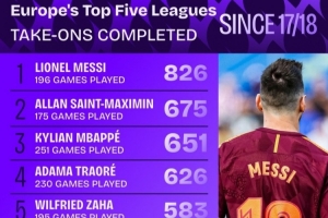 體育資訊11月19日訊 Squawka統(tǒng)計(jì)自17-18賽季以來(lái),五大聯(lián)賽球員成功過(guò)人次數(shù),梅西以826次居首,圣馬克西曼、姆巴佩排在二三位。