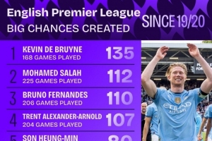 體育資訊11月19日訊 Squawka統(tǒng)計(jì)了2019-2020賽季以來(lái)球員在英超創(chuàng)造重大機(jī)會(huì)的次數(shù),并列出榜單,德布勞內(nèi)、薩拉赫、B費(fèi)排名前三位。