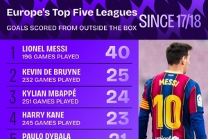 體育資訊11月19日訊 Squawka統(tǒng)計(jì)了2017-2018賽季以來球員在五大聯(lián)賽禁區(qū)外遠(yuǎn)射的進(jìn)球數(shù)量,并列出榜單,梅西40球居首,德布勞內(nèi)25球次席。