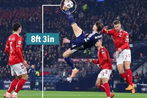 據(jù)太陽(yáng)報(bào)統(tǒng)計(jì),麥克托米奈倒鉤時(shí)腳部高度達(dá)到了8英尺3英寸(約2.53米),比C羅在皇馬時(shí)對(duì)陣尤文的倒鉤高度(7英尺7英寸,約2.38米)還要高。