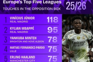 體育資訊11月21日訊 五大聯(lián)賽戰(zhàn)火即將重燃,數(shù)據(jù)機(jī)構(gòu)squakwa也統(tǒng)計了本賽季至今的五大聯(lián)賽球員在對方禁區(qū)內(nèi)觸球次數(shù)情況,維尼修斯力壓隊友姆巴佩居首。