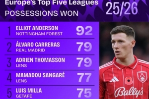 體育資訊11月22日訊 五大聯(lián)賽戰(zhàn)火即將重燃,數(shù)據(jù)機(jī)構(gòu)squakwa也統(tǒng)計(jì)了本賽季至今的五大聯(lián)賽球員贏得球權(quán)次數(shù)情況,諾丁漢森林中場(chǎng)埃利奧特·安德森居首。