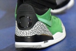 賽前,庫里入場時(shí)穿著的是俄勒岡大學(xué)的專屬Air Jordan 3 PE,通常來說這類球鞋是不市售、僅供球隊(duì)內(nèi)部的。但還是會有相關(guān)人員拿出來售賣,這雙球鞋在二級市場的價(jià)格接近8000美元。