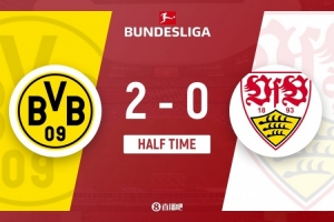 傷停補(bǔ)時(shí)3分鐘。上半場比賽結(jié)束,多特2-0斯圖加特。