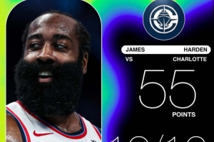 全場比賽,快船球星哈登出戰(zhàn)35分鐘,26中17,三分16中10得到55分3板7助攻1搶斷。