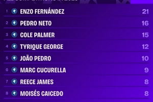 2025年切爾西參與進(jìn)球排名(所有賽事):