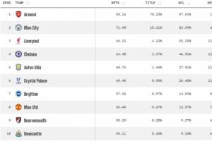 數(shù)據(jù)機(jī)構(gòu)Opta的大數(shù)據(jù)預(yù)測(cè)再度進(jìn)行更新,目前英超各隊(duì)的奪冠概率:阿森納奪冠概率升至70.18%,曼城18.11%;利物浦4.22%,切爾西3.47%。該榜單的第5名為1.44%的維拉,其余球隊(duì)奪冠概率均不足1%。