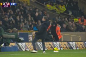 水晶宮在下半場6分鐘2球完勝狼隊(duì),主帥格拉斯納在場邊激情慶祝第二球時(shí)差點(diǎn)滑倒,隨后他順勢轉(zhuǎn)圈握拳鼓勁。