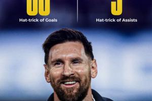 據(jù)統(tǒng)計(jì),38歲的梅西目前進(jìn)球戴帽的場次有60場,助攻戴帽的場次有9場。