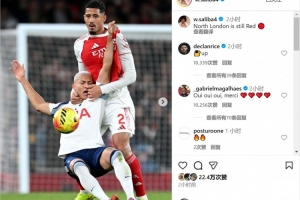 薩利巴社媒曬出防守里沙利松的照片,慶祝球隊取勝,配文:“北倫敦依然是紅色的。”
