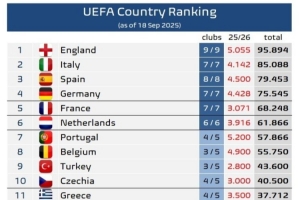 體育資訊9月19日訊 歐冠聯(lián)賽階段首輪已經(jīng)完賽,相關(guān)機(jī)構(gòu)也統(tǒng)計了本賽季的歐戰(zhàn)積分情況,并更新了歐足聯(lián)旗下各協(xié)會的積分排名。英格蘭依然獨自領(lǐng)跑,而意大利第二的位置仍暫時牢固,但領(lǐng)先優(yōu)勢有略微縮小。